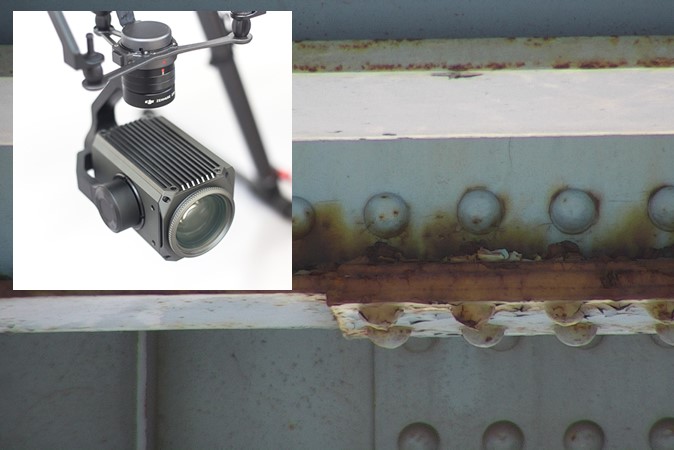 対象物との距離を安全に保ちながら作業を実施するためにズームカメラを活用。近接目視点検と同程度の点検精度を保ちます。